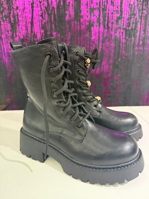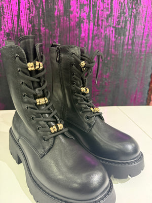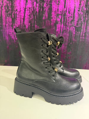 Anfibi donna dal carattere deciso e contemporaneo, ideali per completare look urban e casual chic. Realizzati in ecopelle liscia, si distinguono per i dettagli gioiello color oro removibili sui lacci che aggiungono un tocco glamour a un design grintoso. La suola carrarmato garantisce comfort, stabilità e un’ottima aderenza.