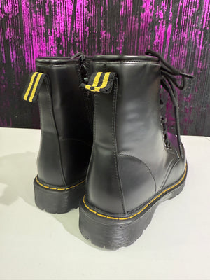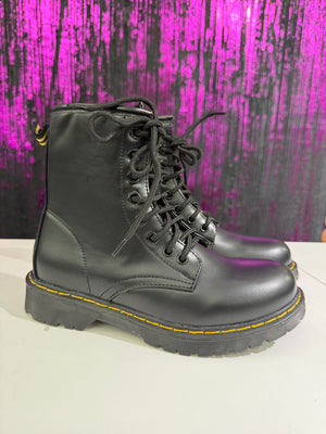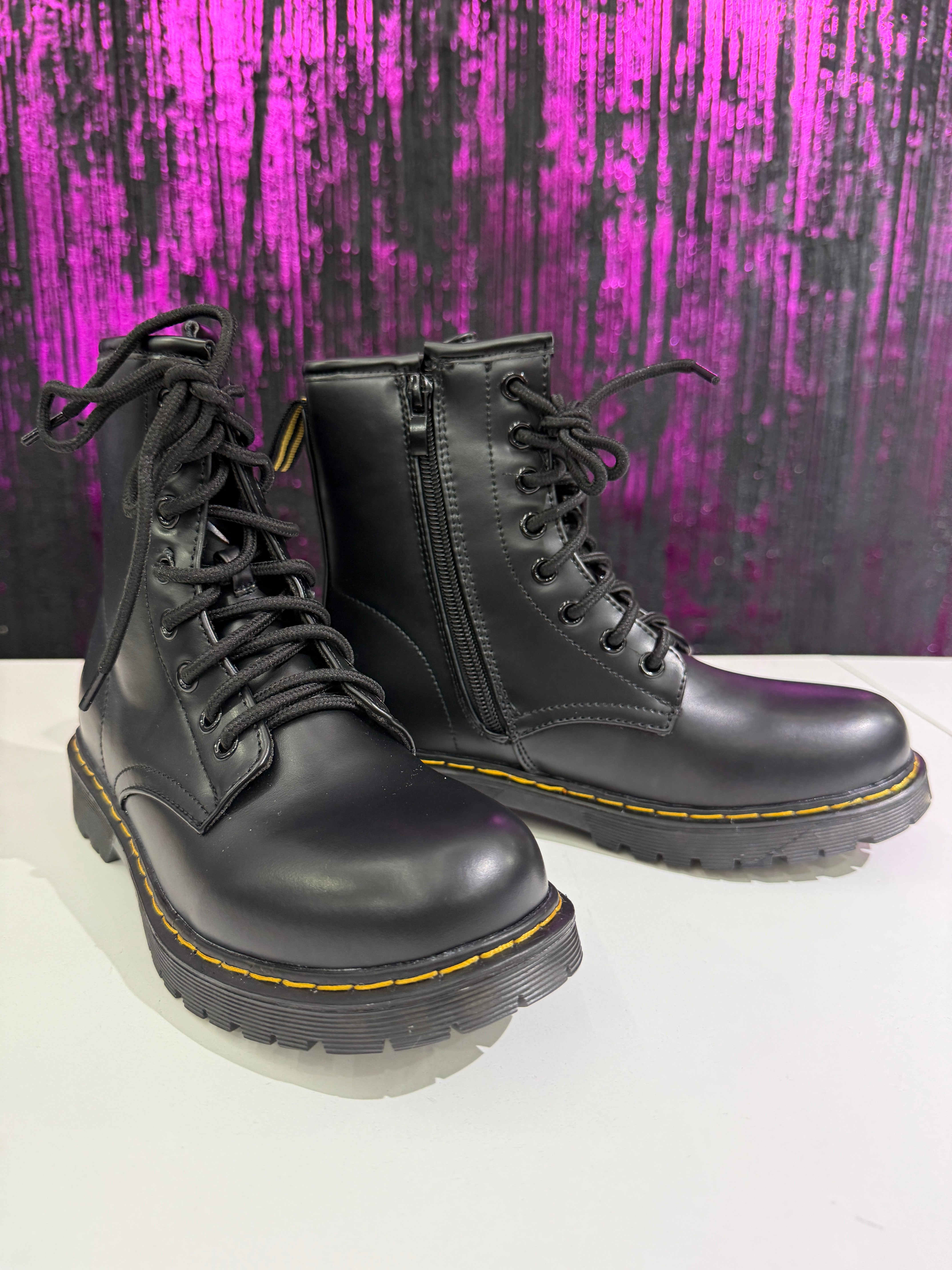 Anfibi neri dal design grintoso e versatile, perfetti per look streetwear e casual. Realizzati in materiale resistente, con cuciture a contrasto e suola carrarmato antiscivolo. Chiusura con lacci + zip laterale per una calzata pratica e veloce.