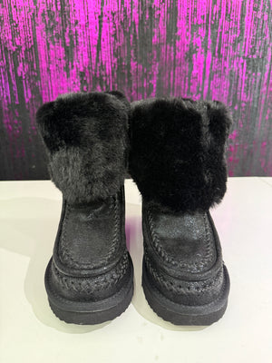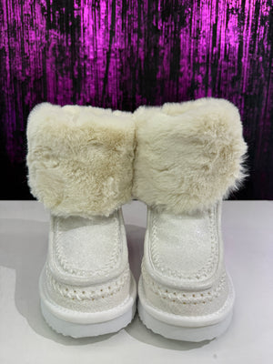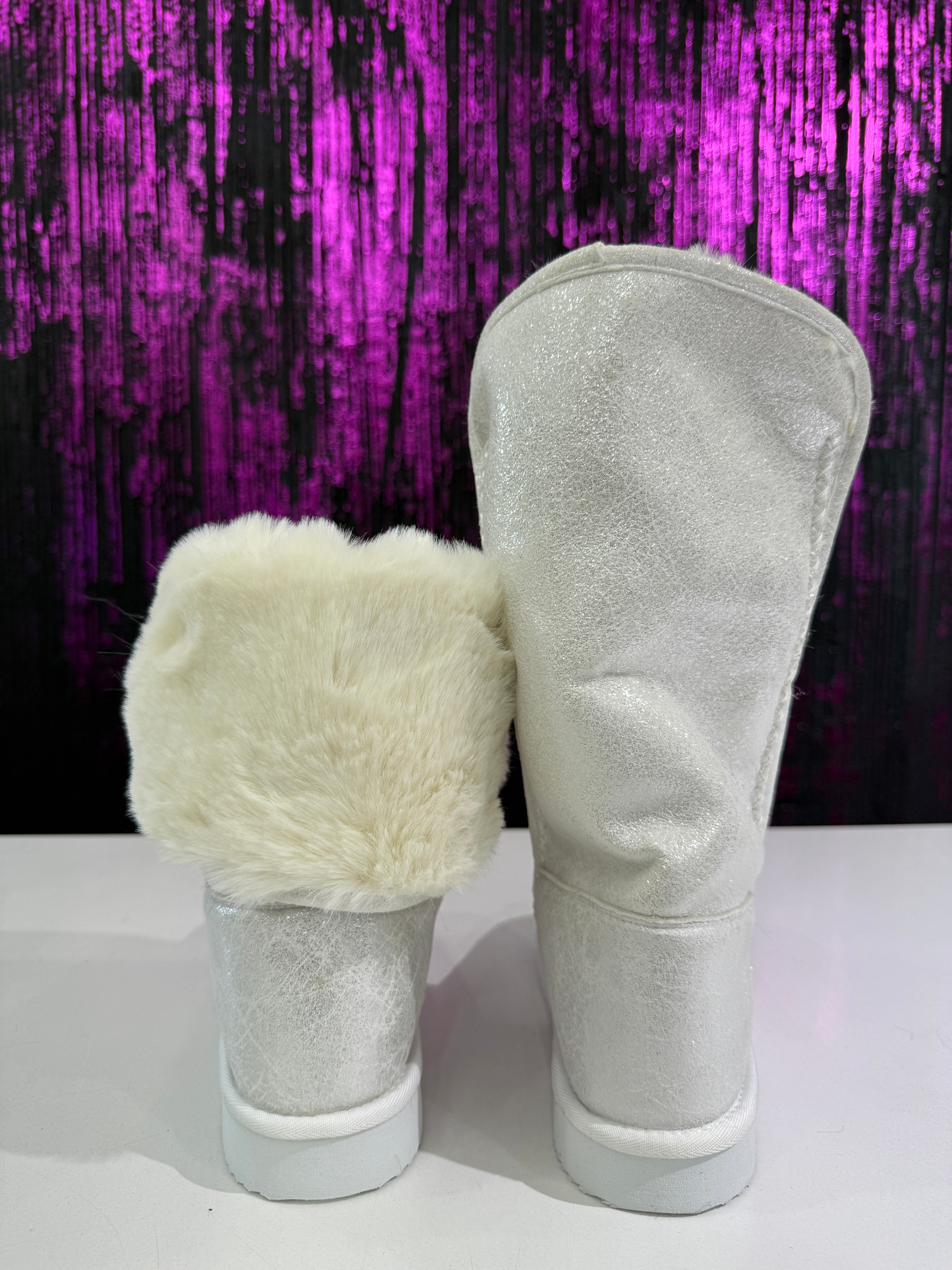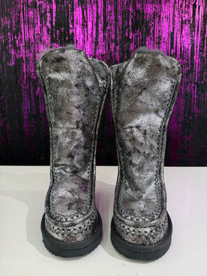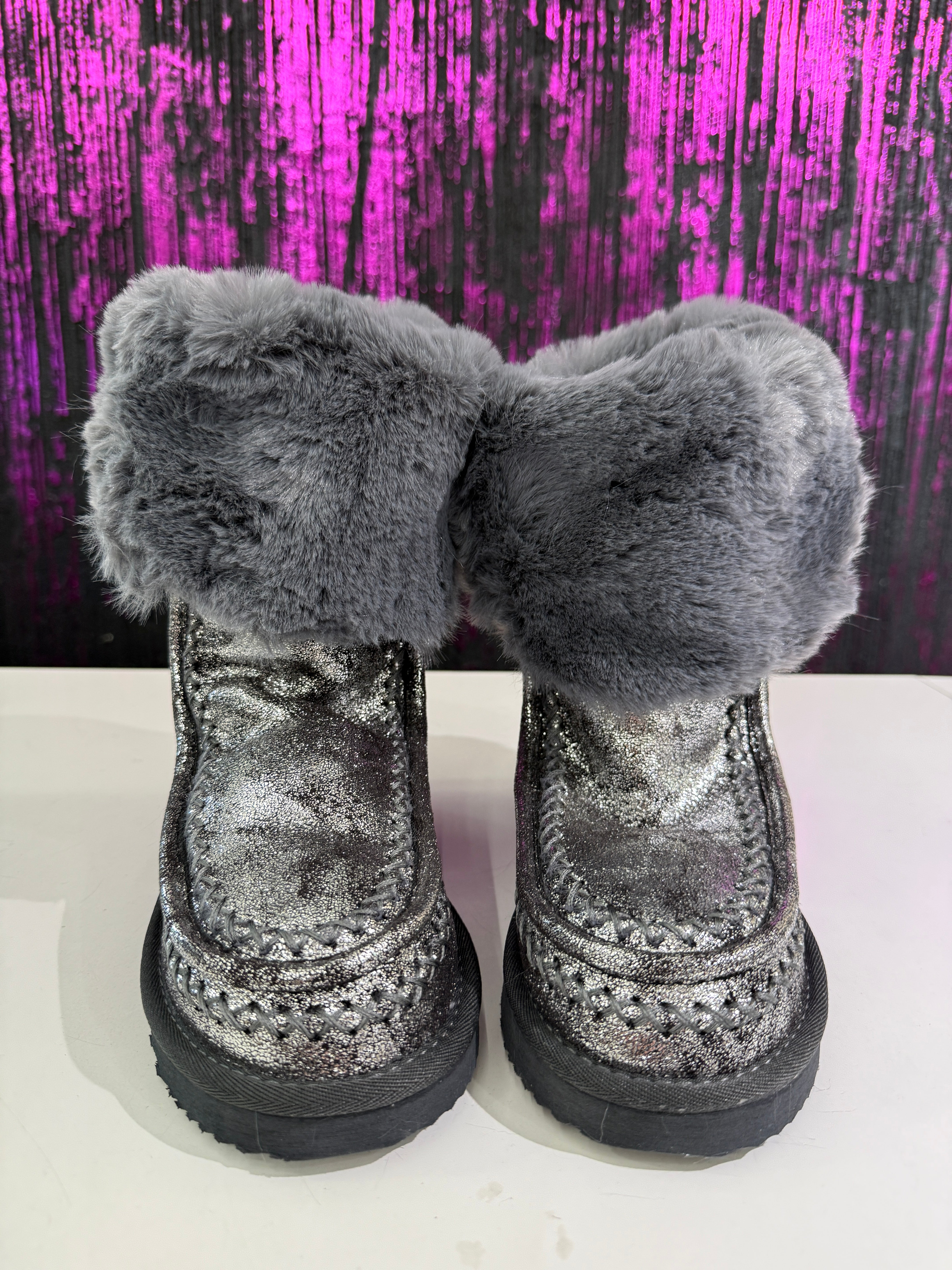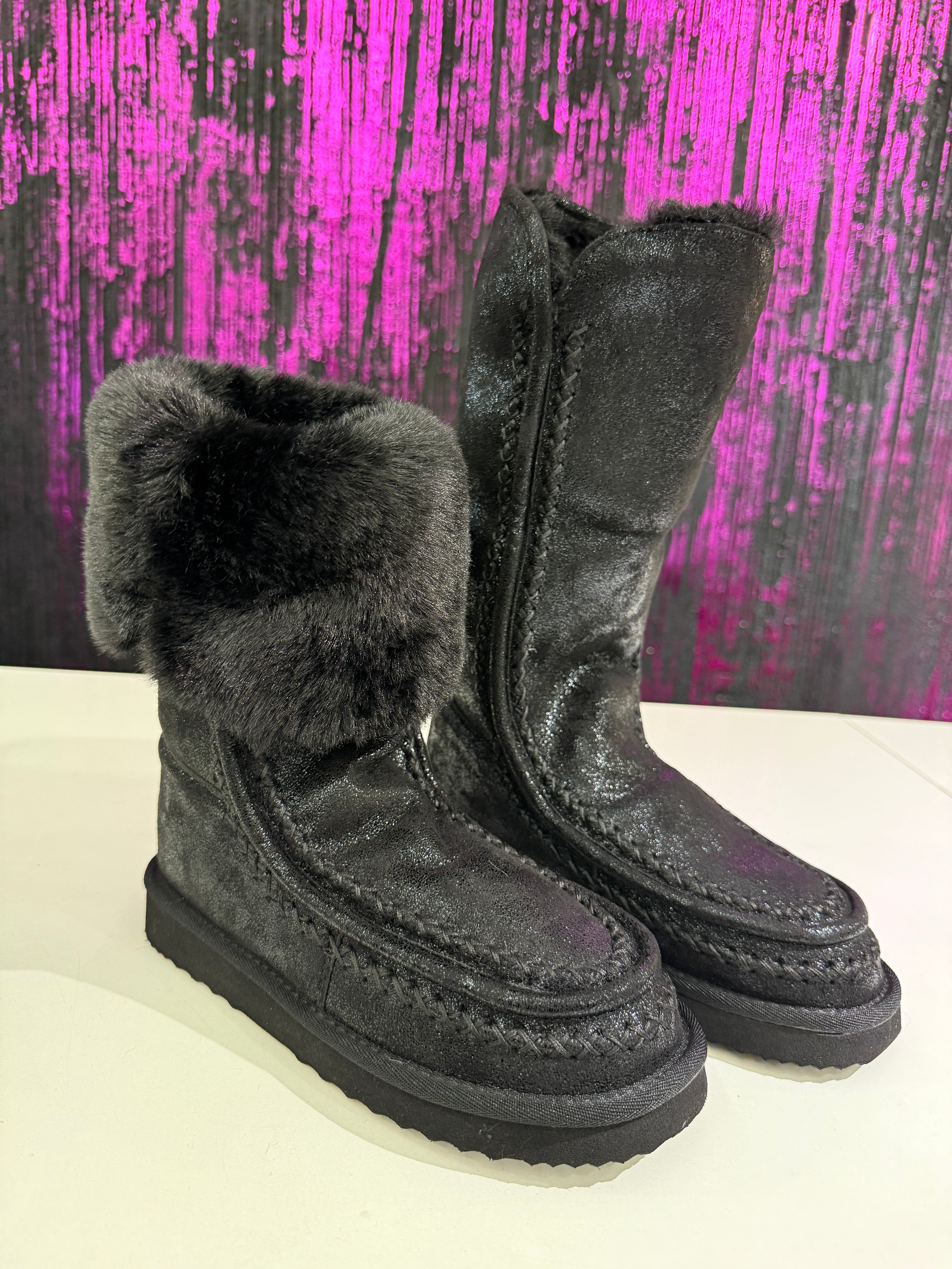 Stivale invernale caldo e avvolgente, realizzato in materiale effetto scamosciato con dettagli brillanti e interno completamente foderato in morbida eco-pelliccia. Cuciture decorative artigianali e suola in gomma antiscivolo, perfetti per affrontare la stagione fredda con stile.
