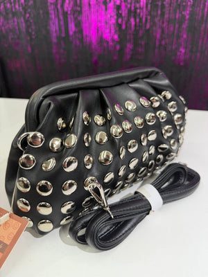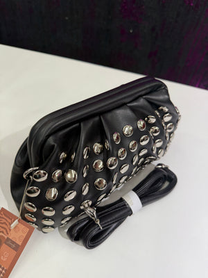 Clutch dal carattere deciso realizzata in materiale effetto pelle nera, impreziosita da borchie tonde metalliche argentate su tutta la superficie. Il design morbido e strutturato allo stesso tempo la rende un accessorio di forte impatto, ideale per valorizzare outfit serali e look fashion.