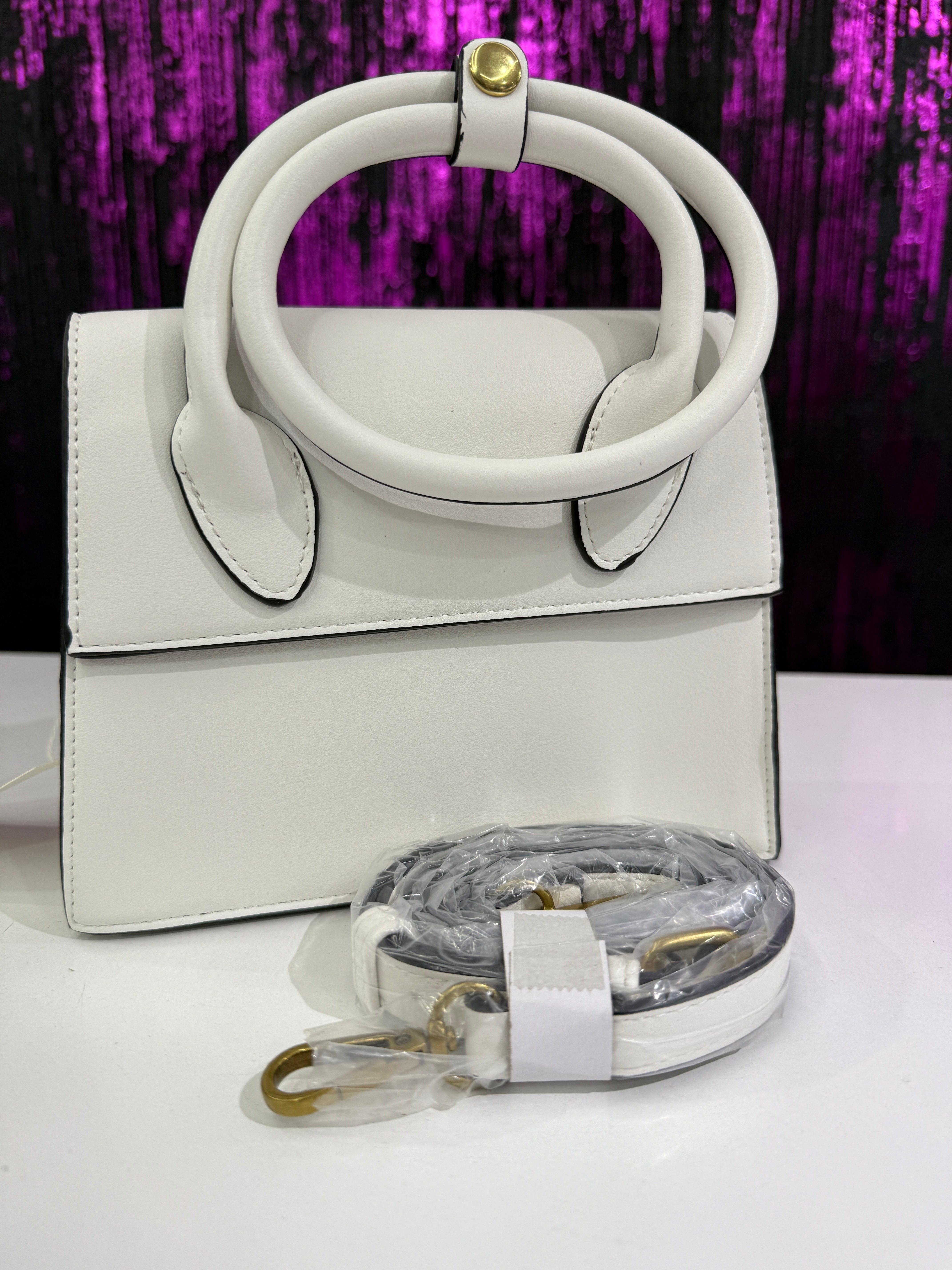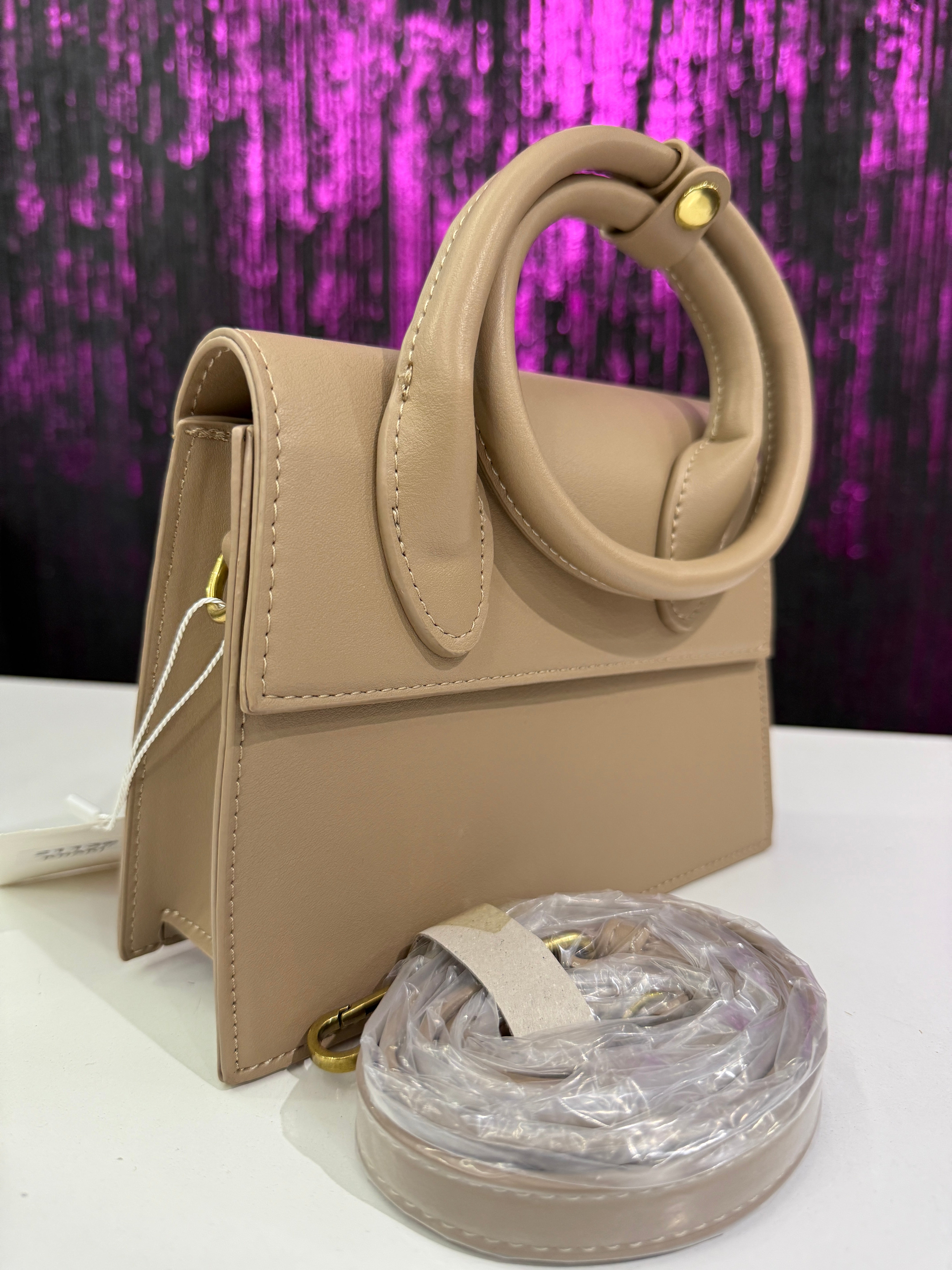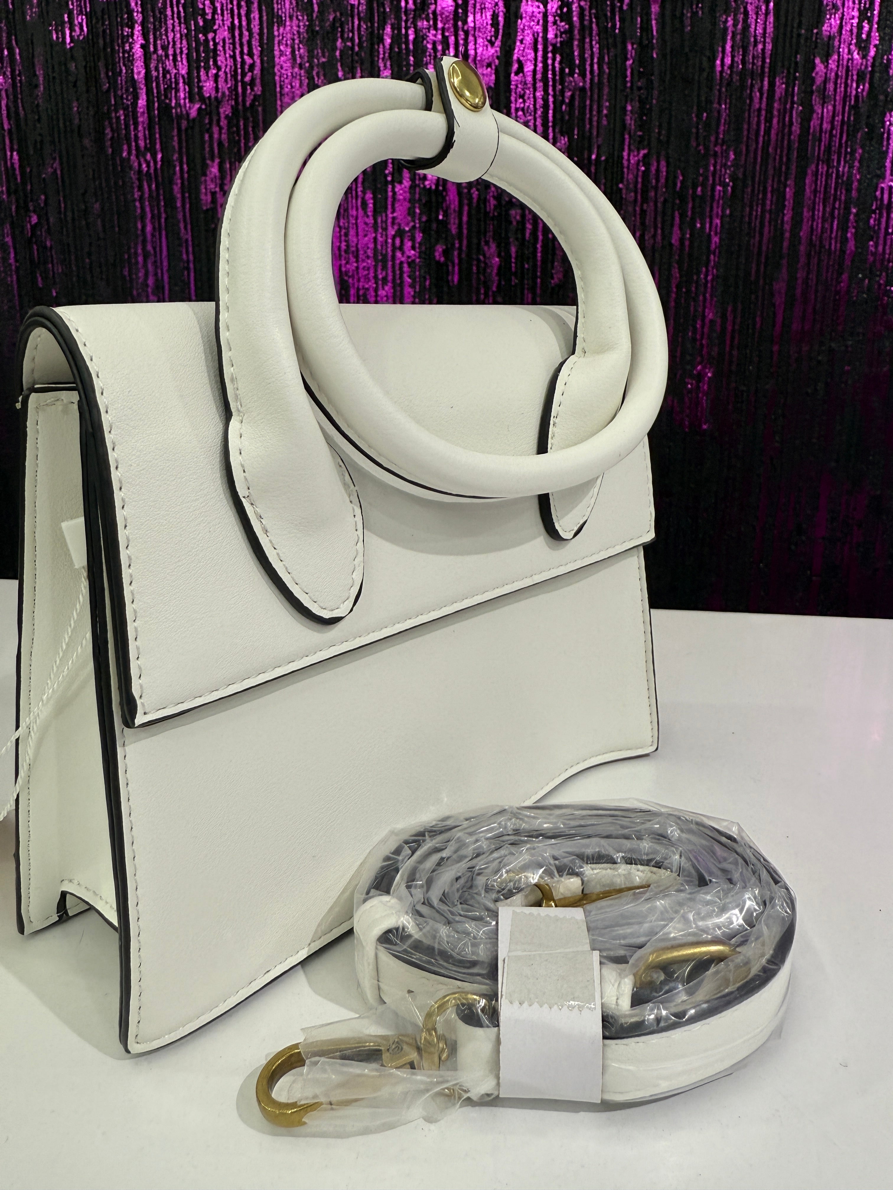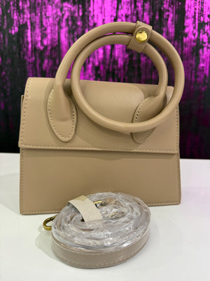 Borsa elegante e compatta dal design strutturato, caratterizzata da doppi manici circolari rigidi. Un accessorio raffinato e versatile, perfetto per completare look quotidiani o outfit più formali.