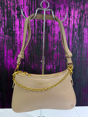 Elegante borsa a spalla firmata Enrico Coveri, realizzata in ecopelle martellata di alta qualità. Caratterizzata da un design morbido, silhouette slanciata e dettagli metallici oro, tra cui la catena decorativa frontale. Perfetta per look casual-chic e outfit serali.