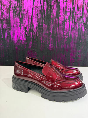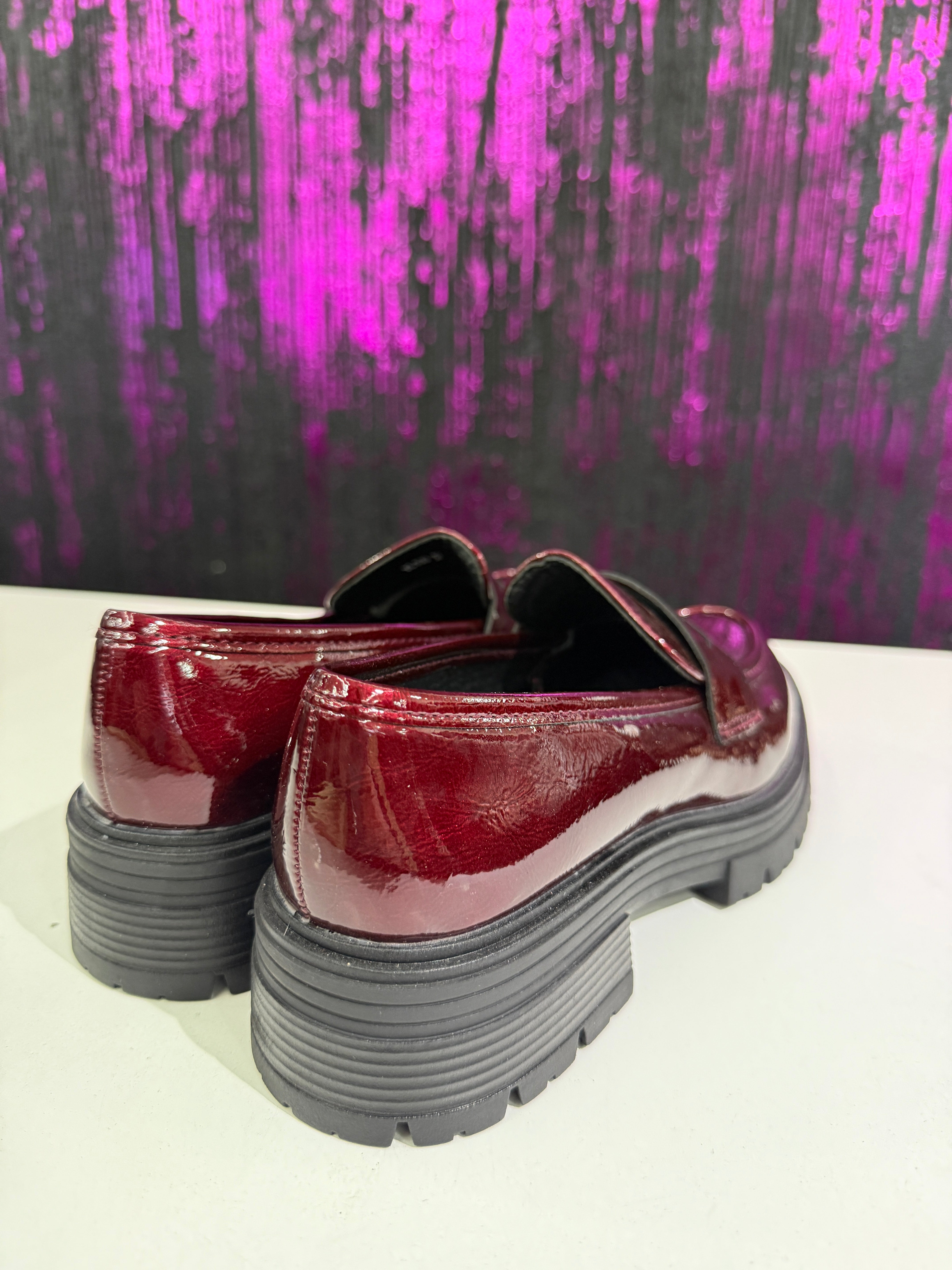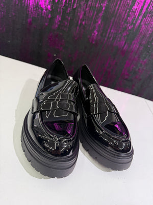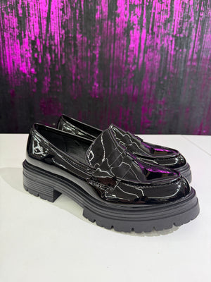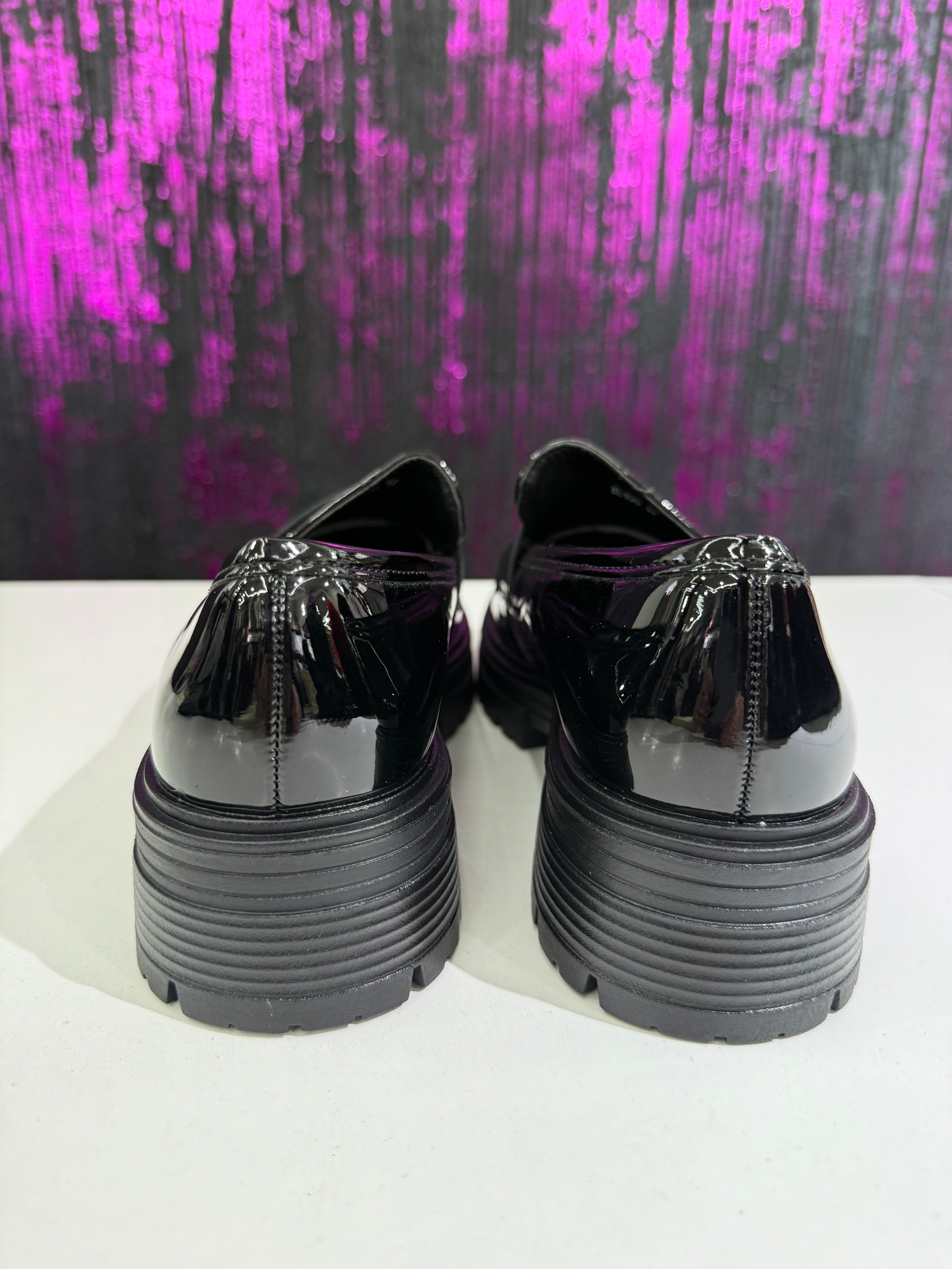 Mocassino donna dallo stile grintoso e contemporaneo, realizzato in elegante vernice nera lucida. Il design classico viene reinterpretato con una suola platform carrarmato che dona carattere e comfort, perfetto per look urbani e di tendenza. Ideale da indossare sia con outfit casual che più ricercati.