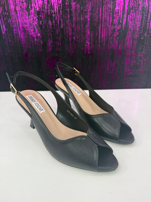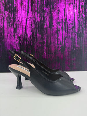 Slingback neri classico e raffinato del brand Chiara Foscari. Sono caratterizzati da una silhouette a punta aperta (peep-toe), un'elegante scollatura a V sul davanti e un tacco a rocchetto (spool heel) di media altezza, che offre un ottimo equilibrio tra stile e stabilità.