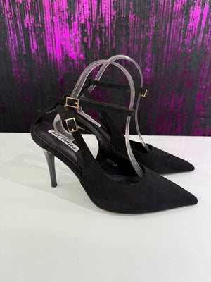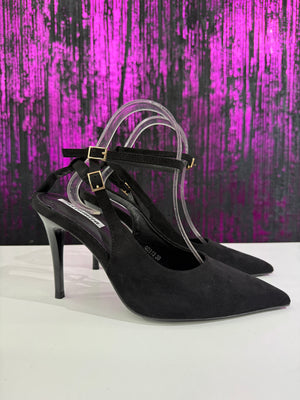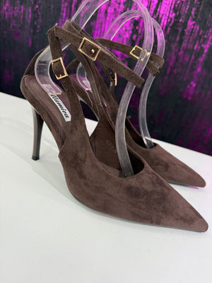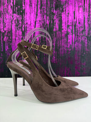 Slingback da donna eleganti e raffinate, realizzate in materiale effetto camoscio color cuoio. La punta affusolata slancia la figura, mentre il cinturino regolabile alla caviglia garantisce stabilità e una calzata sicura. Il tacco alto e sottile dona femminilità ed eleganza, rendendo questa scarpa ideale per occasioni speciali e look ricercati.