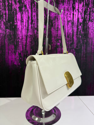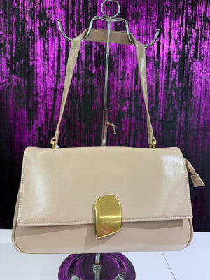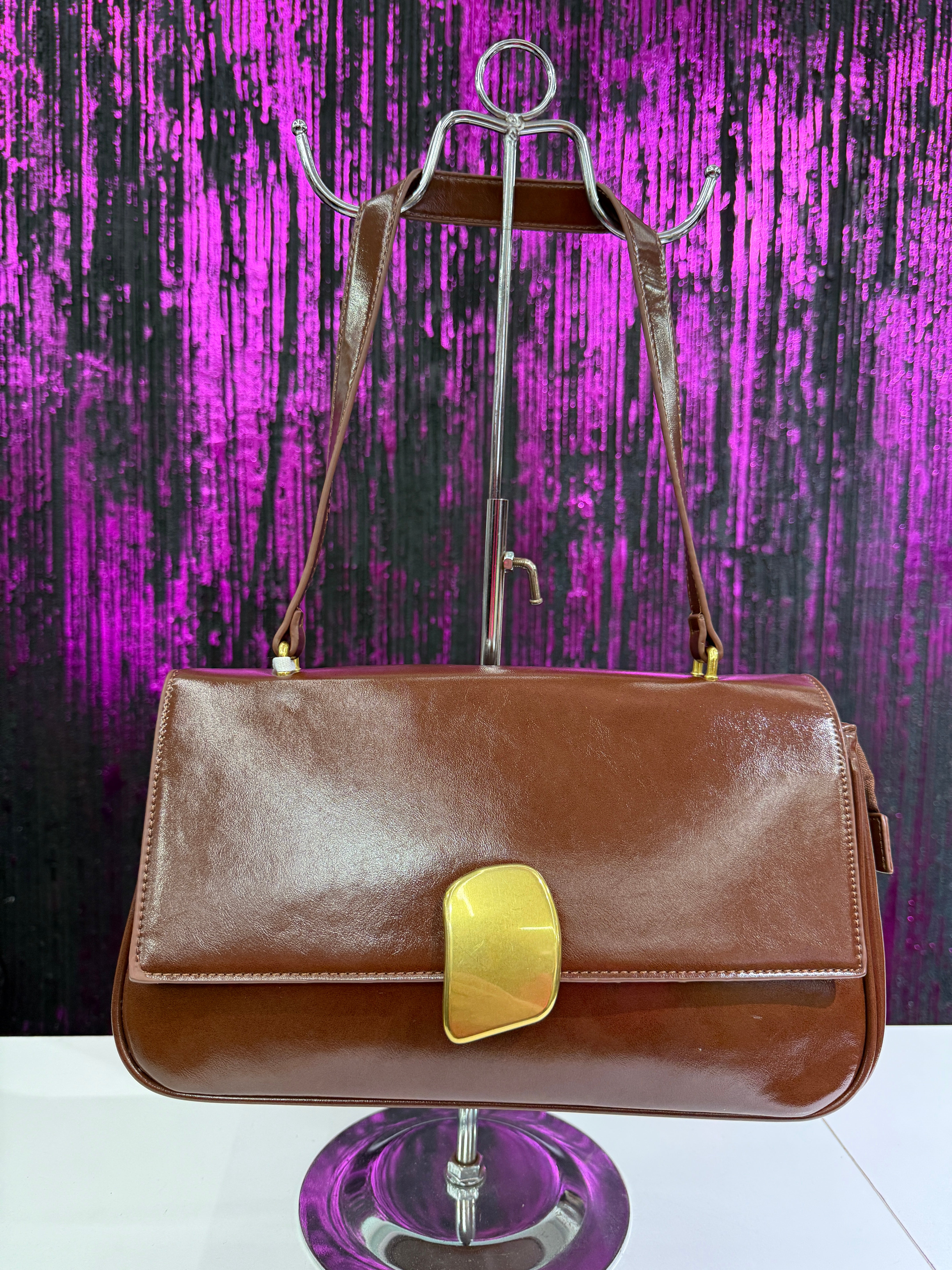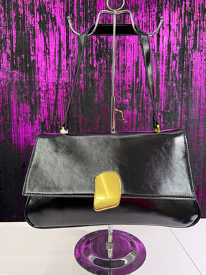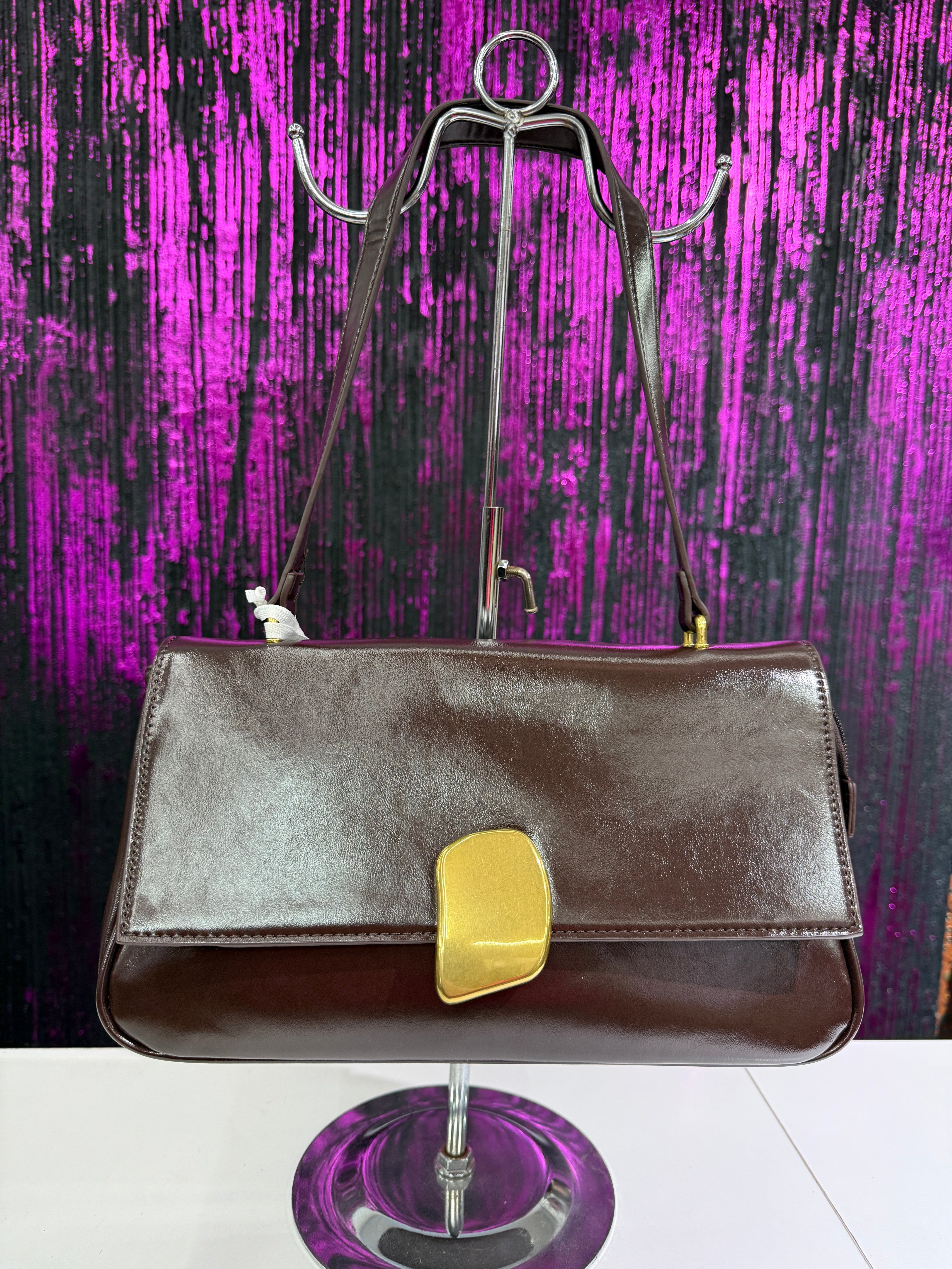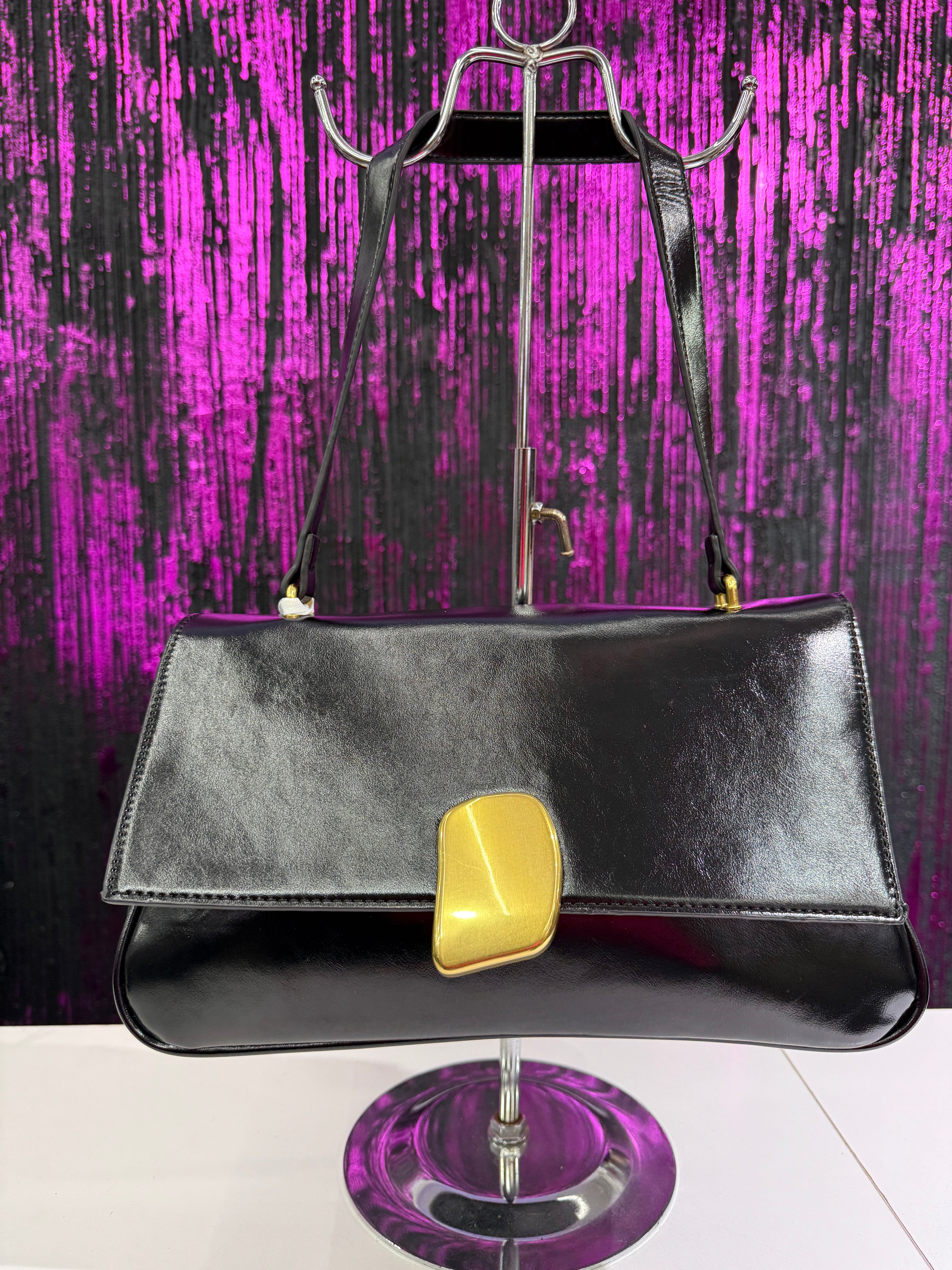 Elegante borsa a spalla rigida con finitura lucida, caratterizzata da una chiusura frontale in metallo gold dal design moderno. Perfetta per look chic sia quotidiani che serali.