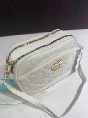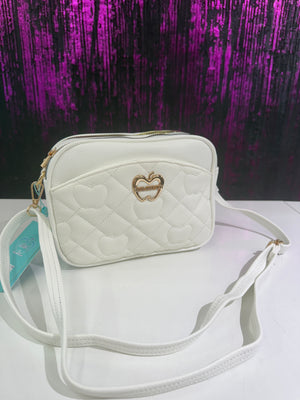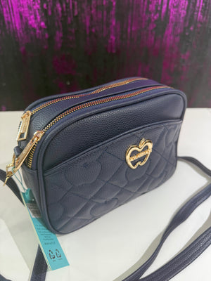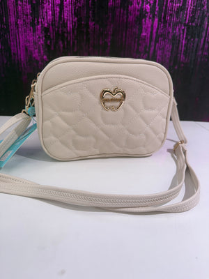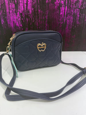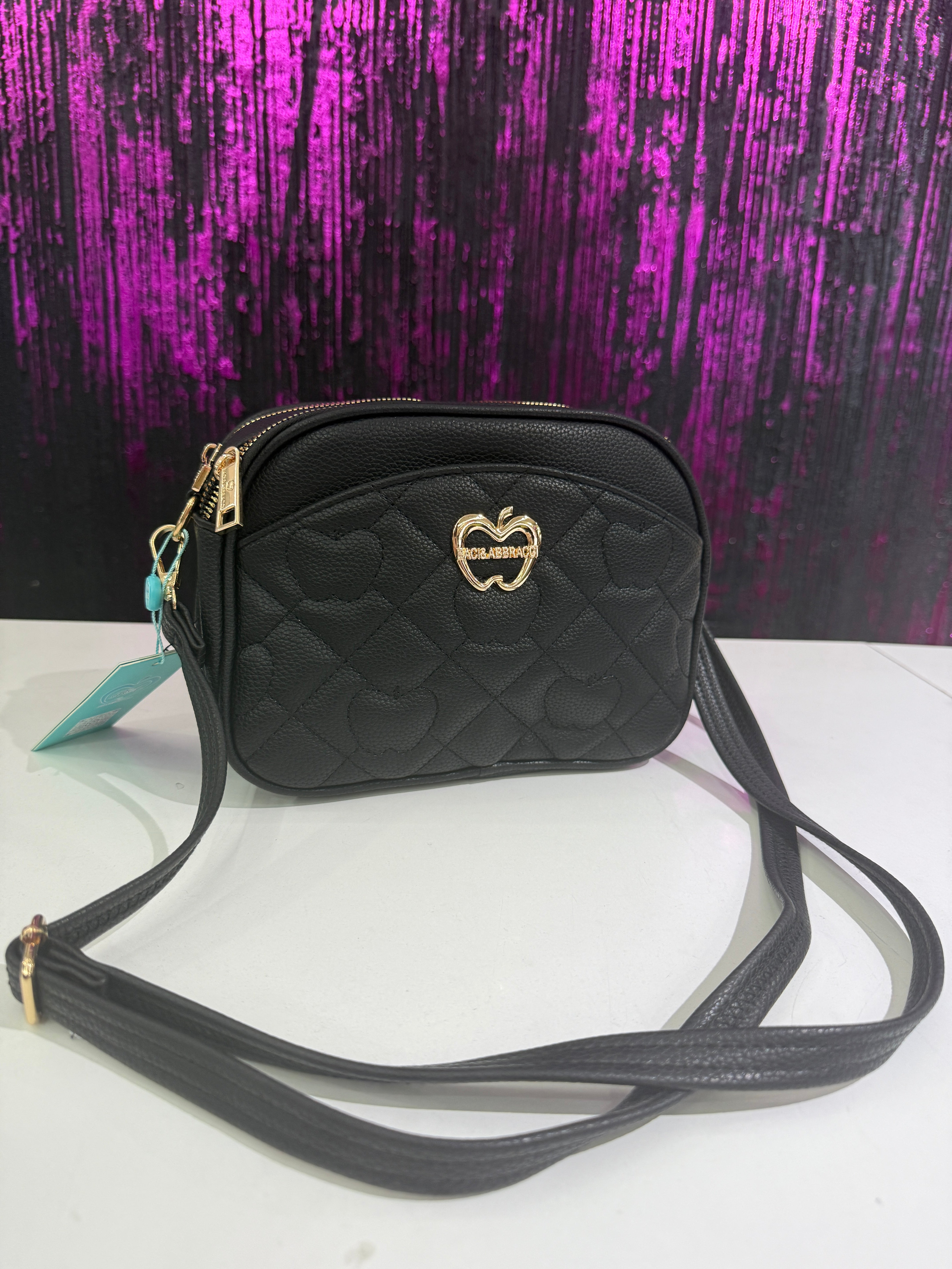 Borsa a tracolla dal design elegante e femminile, realizzata in materiale effetto pelle con raffinata lavorazione trapuntata a cuori. Il logo frontale con dettaglio dorato a forma di mela aggiunge un tocco distintivo e glamour. Compatta ma funzionale, è perfetta per
