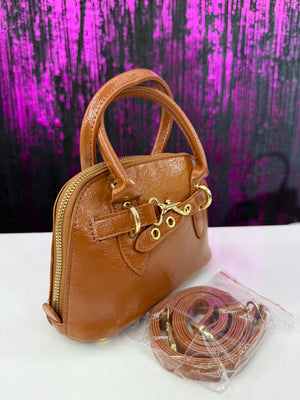 Borsa a mano in pelle color cuoio è un modello raffinato che richiama il design dell'iconica borsa Aventure di Miu Miu. Si distingue per la sua silhouette a bauletto strutturato con angoli arrotondati, doppi manici rigidi e un caratteristico dettaglio frontale con cinturino e gancio metallico dorat
