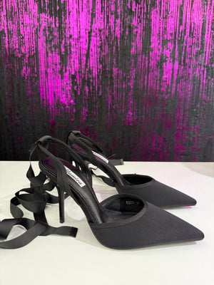 Slingback dal carattere deciso e sensuale, caratterizzata da punta affusolata e raffinati lacci incrociati che avvolgono la caviglia e la gamba, valorizzando la silhouette. Il design minimal ed elegante è completato da un tacco a spillo slanciato, perfetto per look serali e outfit fashion di forte impatto.
