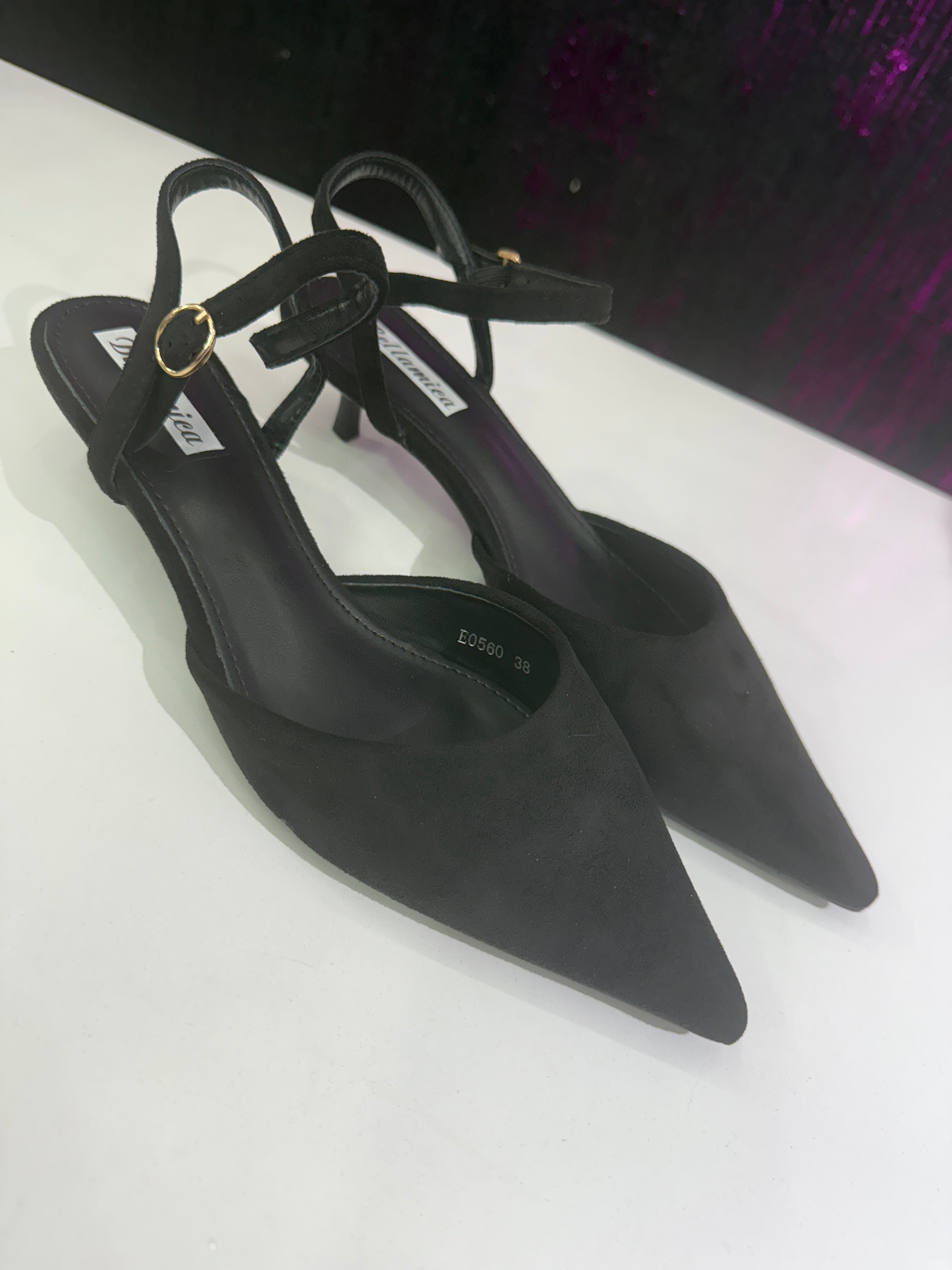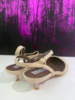 Slingback dal gusto raffinato e femminile, realizzata in morbido camoscio color marrone. La linea essenziale con punta affusolata slancia la figura, mentre il cinturino posteriore con fibbia dorata garantisce una calzata stabile ed elegante. Il tacco basso la rende ideale per un utilizzo quotidiano senza rinunciare allo stile.