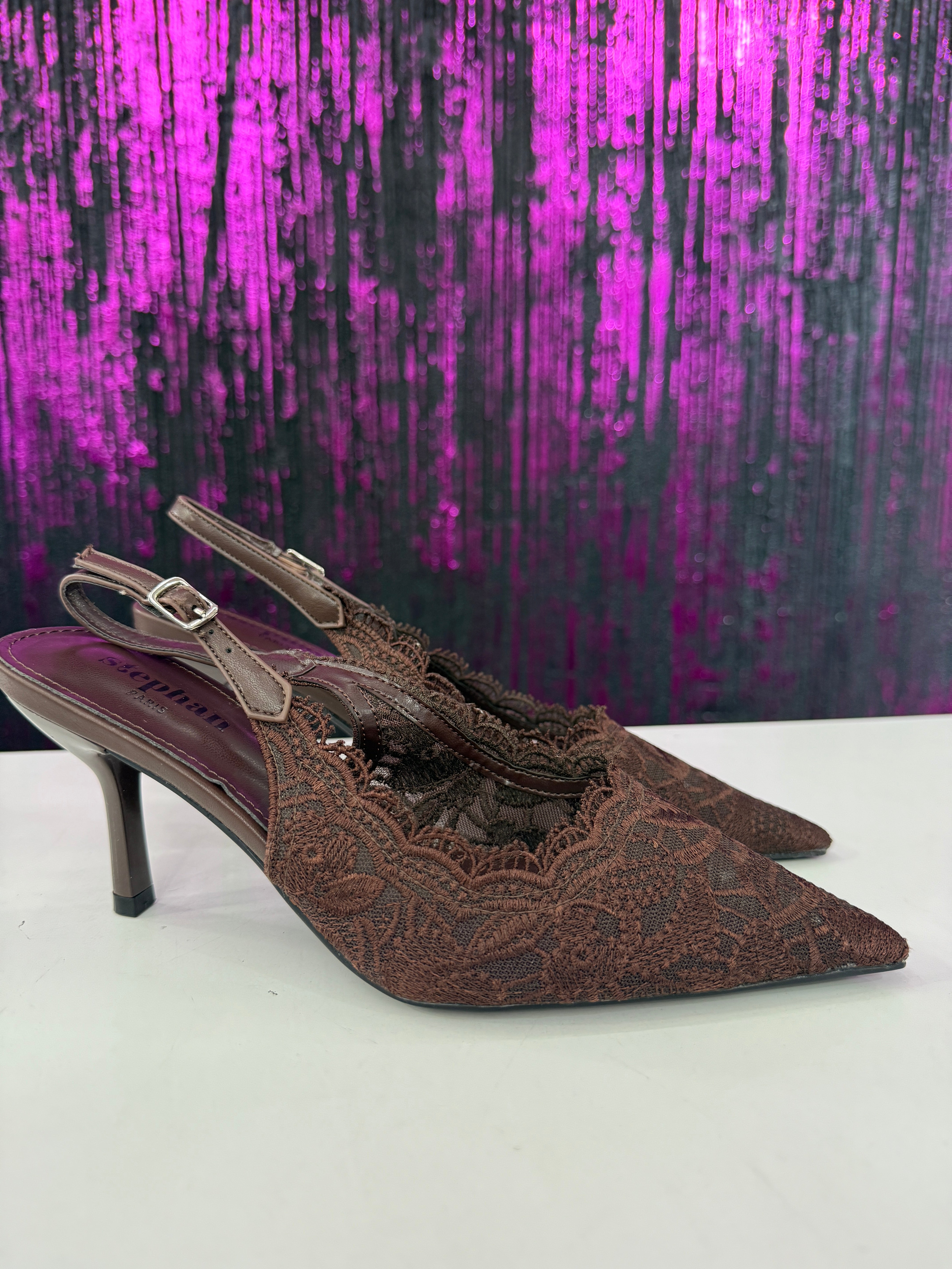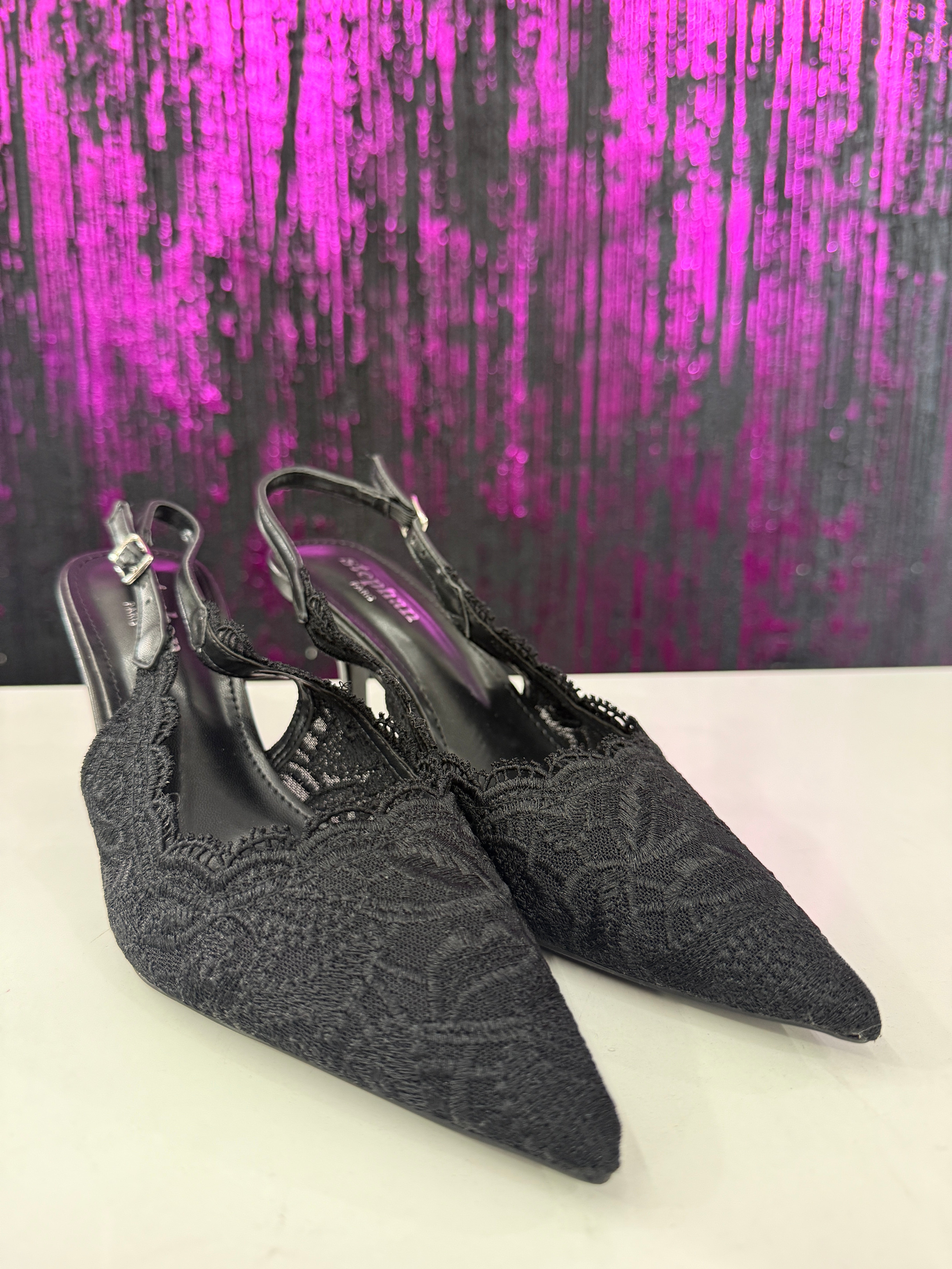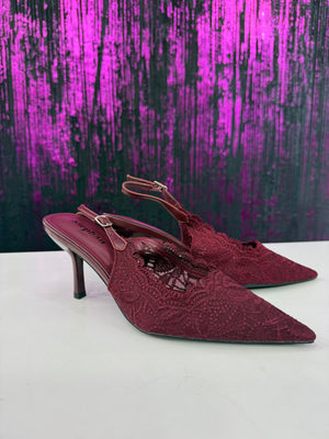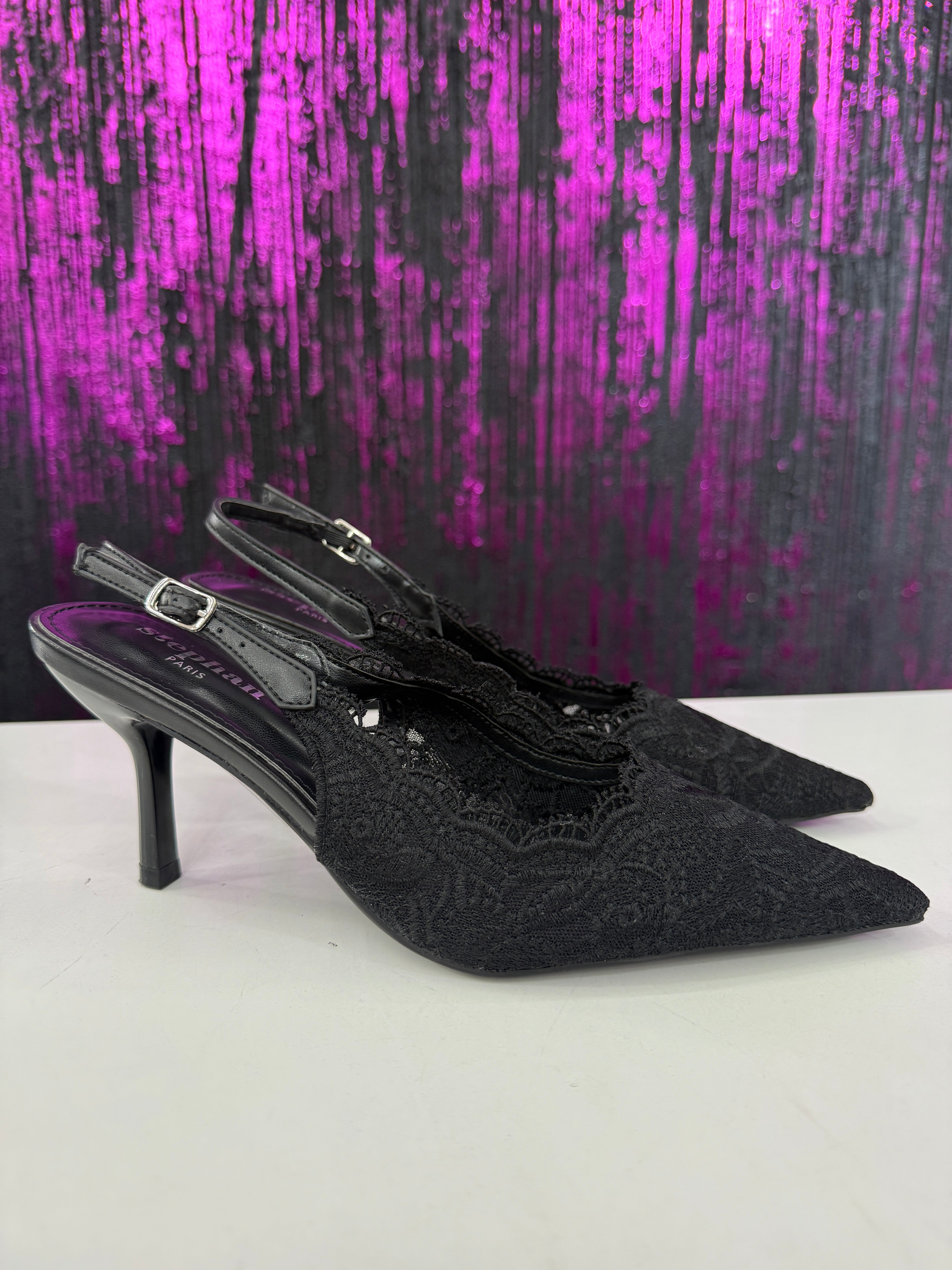 Slingback elegante in raffinato pizzo con lavorazione ricamata a motivo floreale. La punta affusolata slancia la silhouette, mentre il cinturino regolabile garantisce una calzata stabile e confortevole. Il tacco medio sottile dona femminilità mantenendo praticità, rendendo il modello ideale per cerimonie, eventi o outfit serali sofisticati.