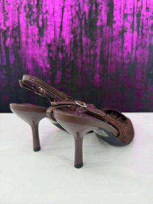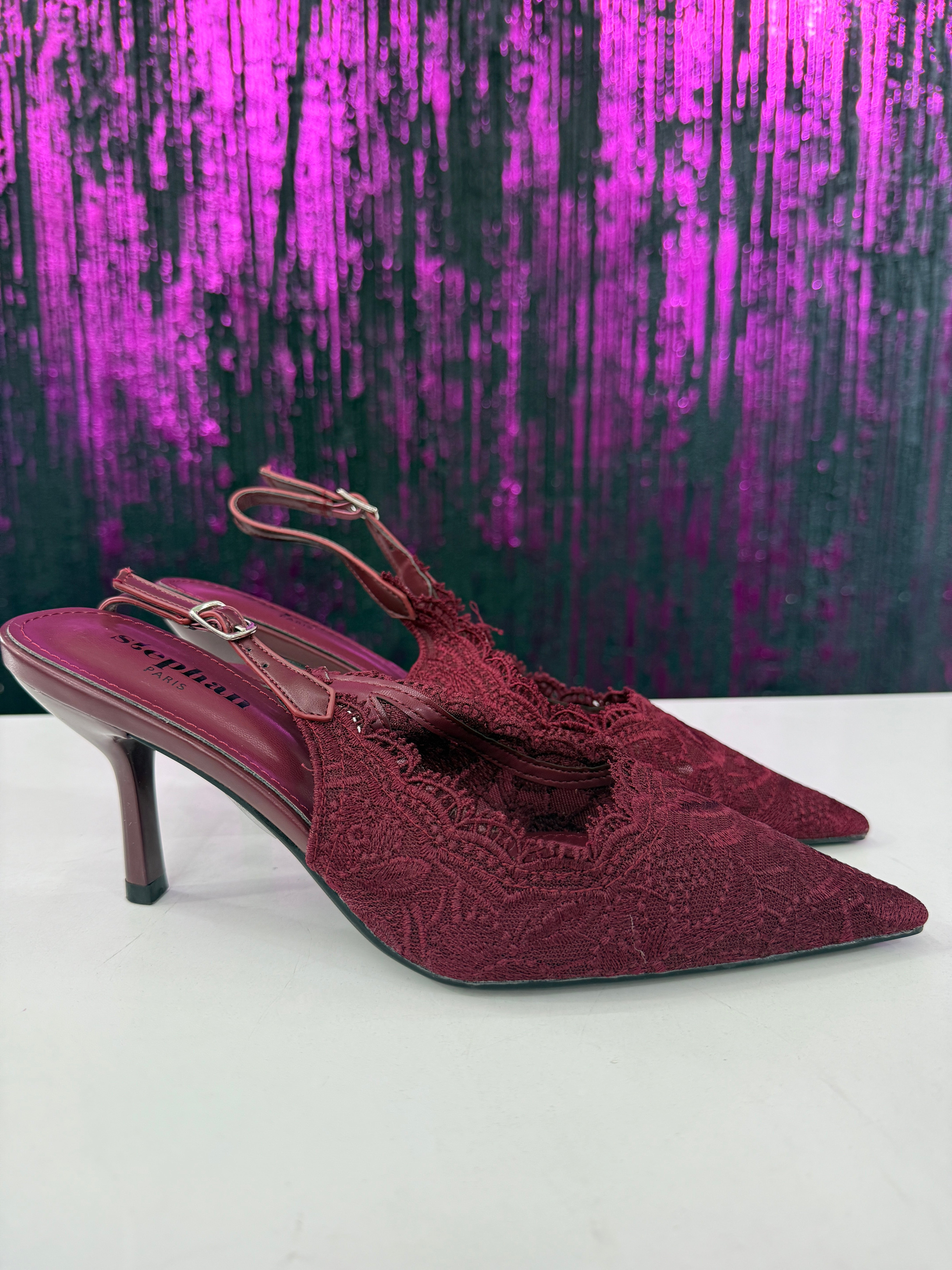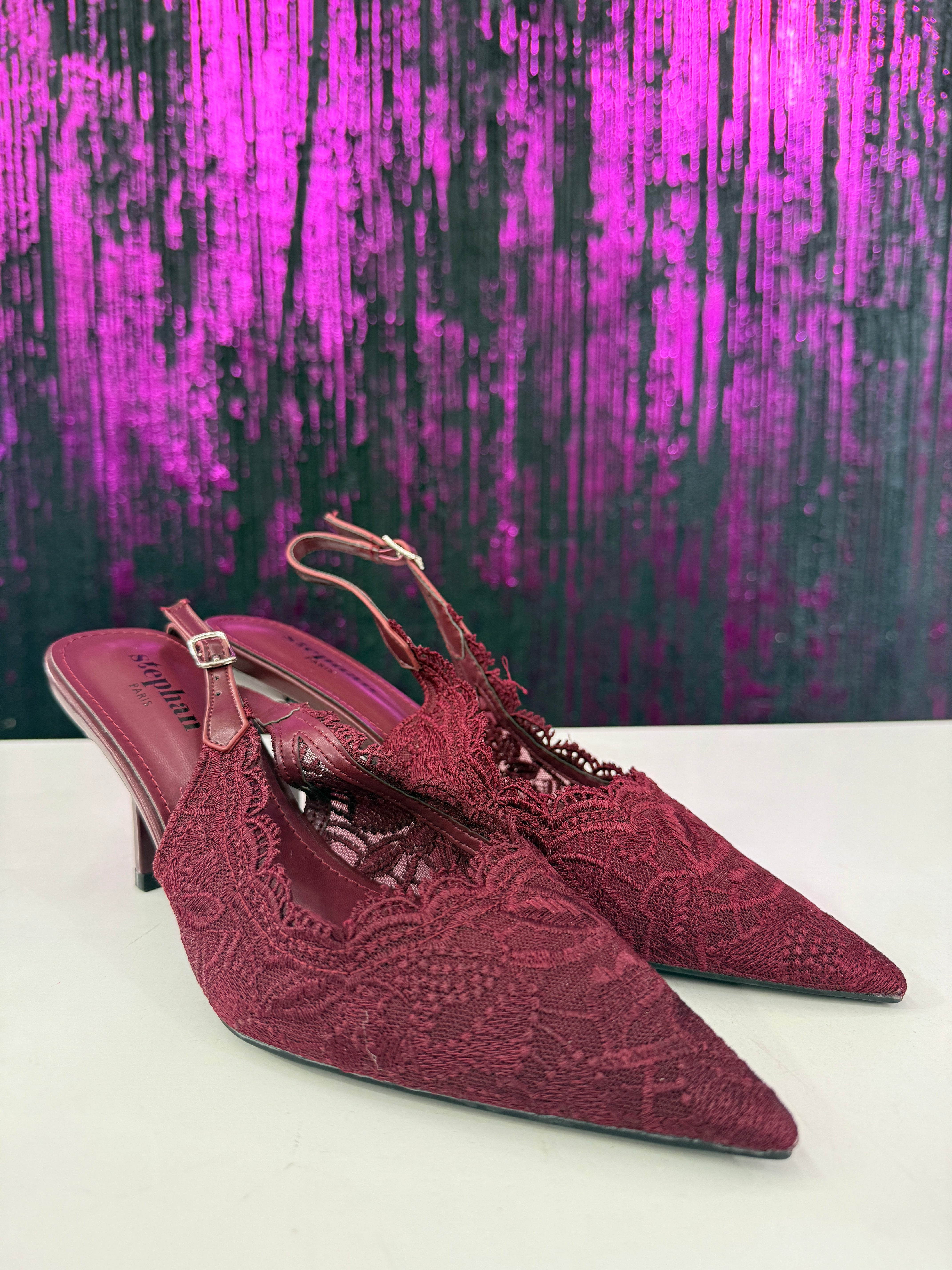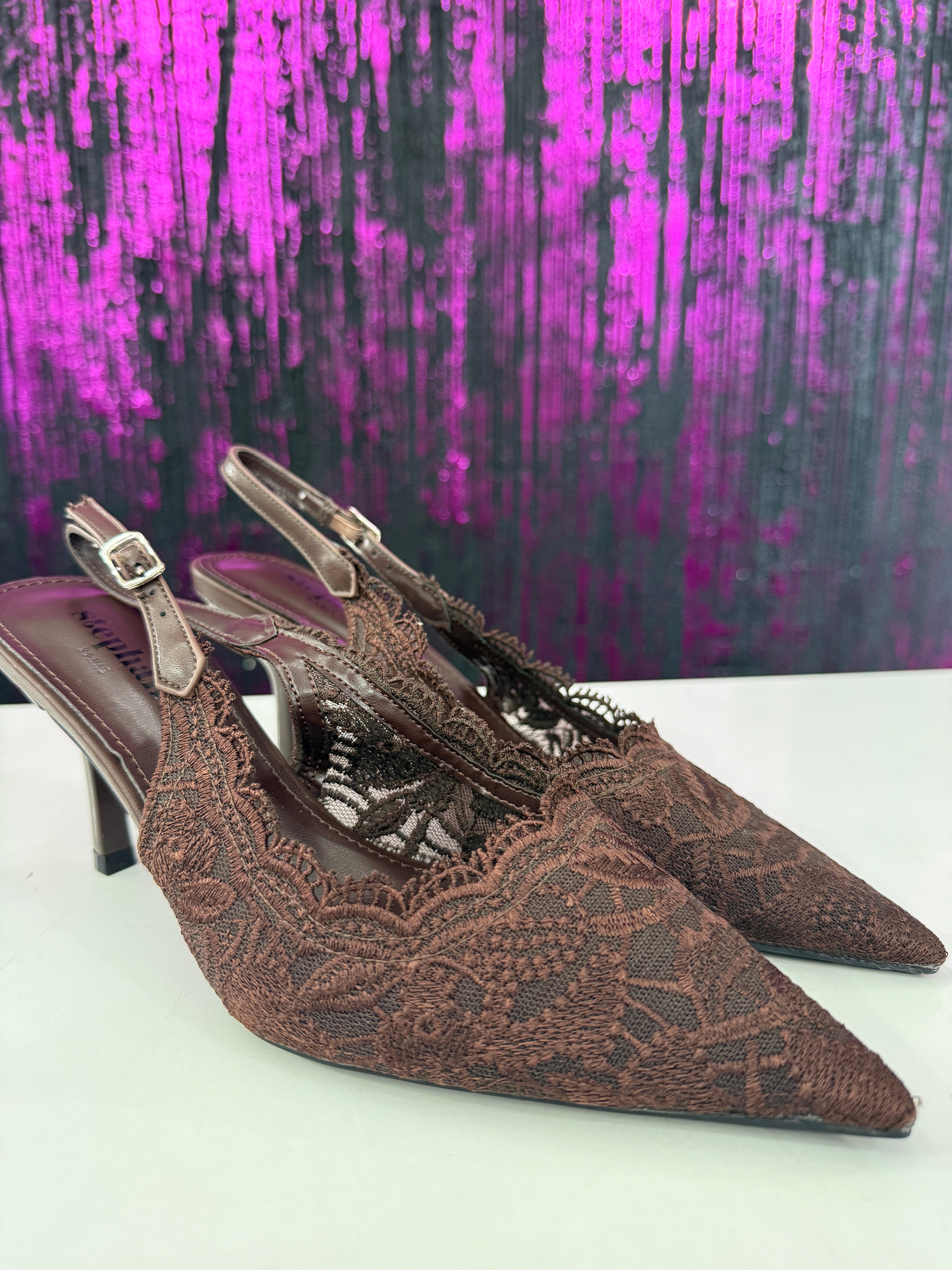Slingback elegante in raffinato pizzo con lavorazione ricamata a motivo floreale. La punta affusolata slancia la silhouette, mentre il cinturino regolabile garantisce una calzata stabile e confortevole. Il tacco medio sottile dona femminilità mantenendo praticità, rendendo il modello ideale per cerimonie, eventi o outfit serali sofisticati.