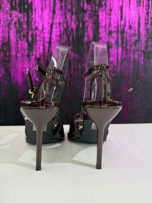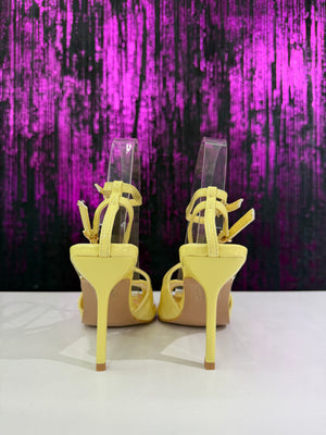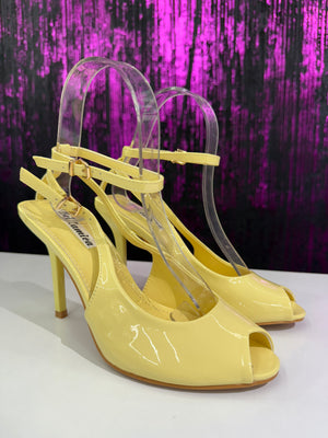Slingback dal design femminile e luminoso, realizzata in vernice lucida color giallo. La punta aperta i doppi cinturini regolabili slanciano la silhouette e assicurano una calzata stabile. Il tacco alto e sottile valorizza la figura, rendendo il modello ideale per occasioni eleganti e look da sera.