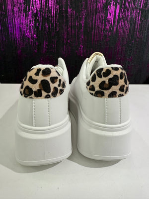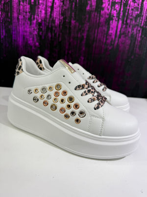 Sneaker dal design moderno e femminile, caratterizzata da una maxi suola platform e dettagli metallici che valorizzano il look quotidiano con un tocco glamour.